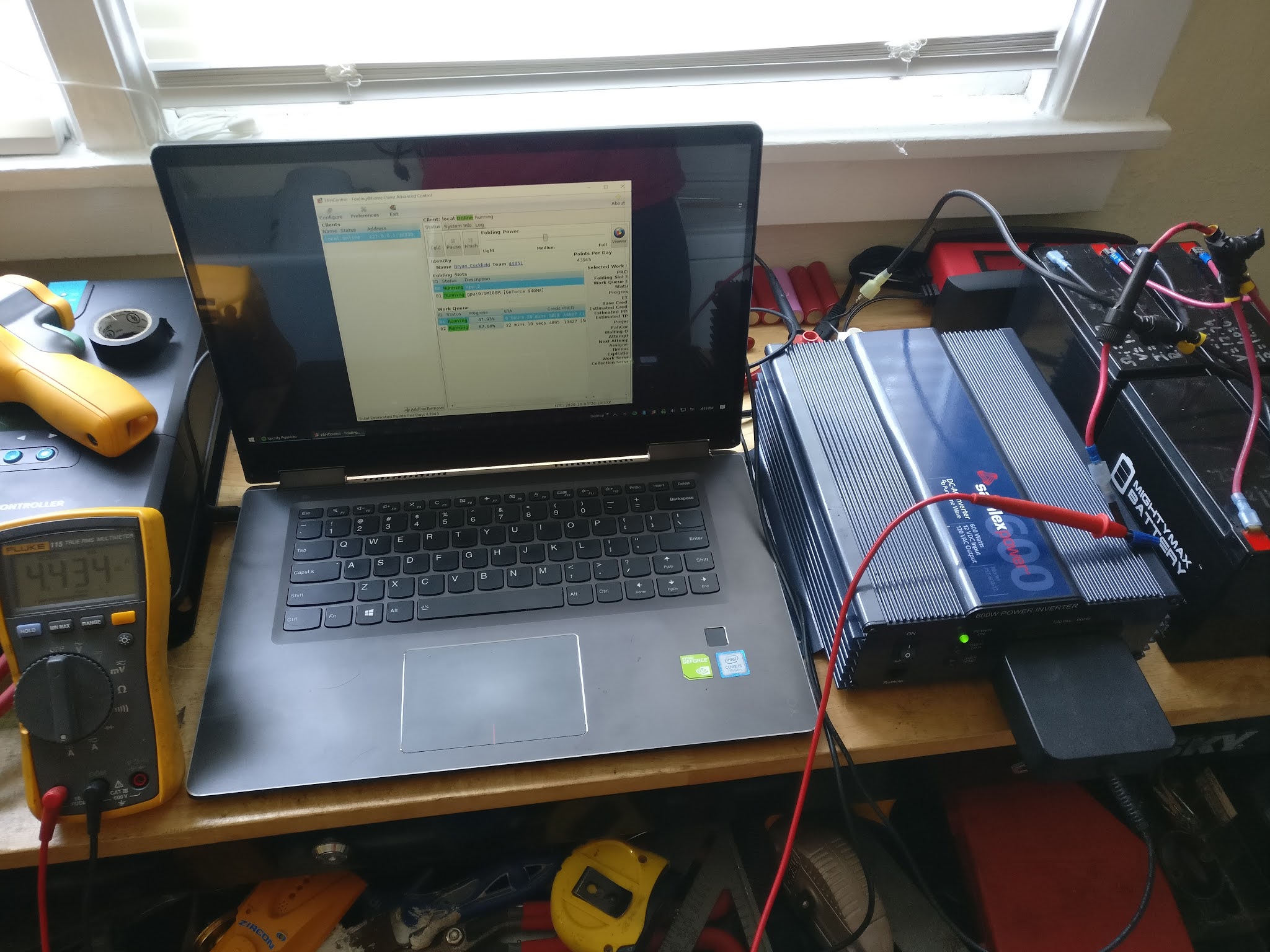 As a dummy load, I hooked up this laptop to a 600W true sine wave inverter and measured the current draw to calculate the power consumption. Then I let it run until the low voltage alarm on the inverter went off, and then I calculated the energy in the batteries based on the amount of time the test lasted. The laptop didn’t have a battery in it at all, and ran Folding@Home which is a very power-hungry application. I averaged 50W continuous with this setup.