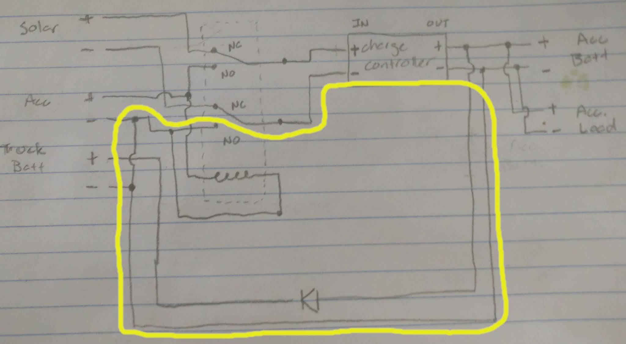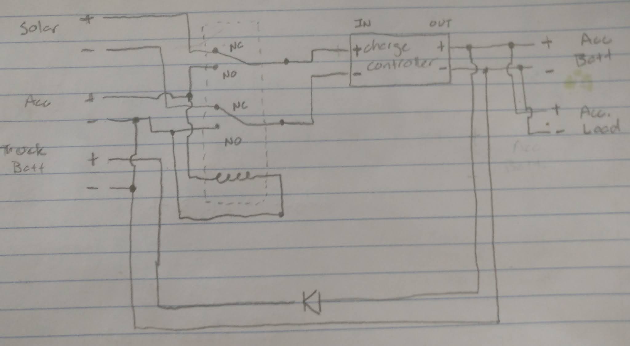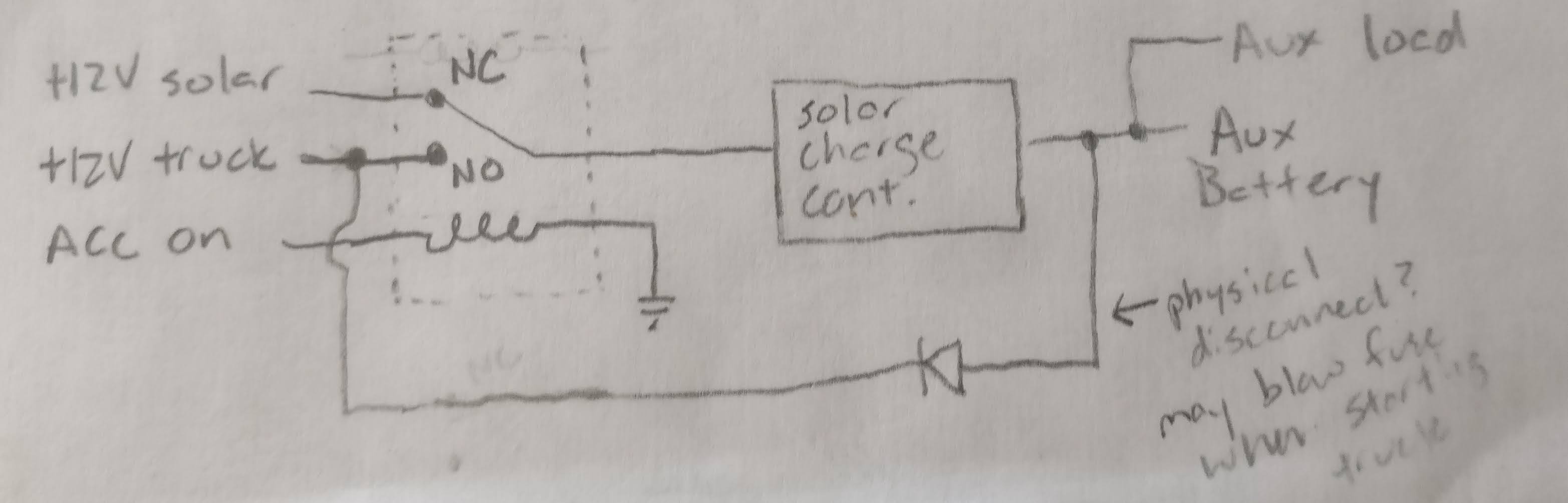 Genius! This design only requires one relay and no diodes, and doesn’t waste any precious solar energy. The only downside, I realized after a little while, is that it can’t keep the truck’s battery topped off with excess energy from the solar panel. So I added one diode: