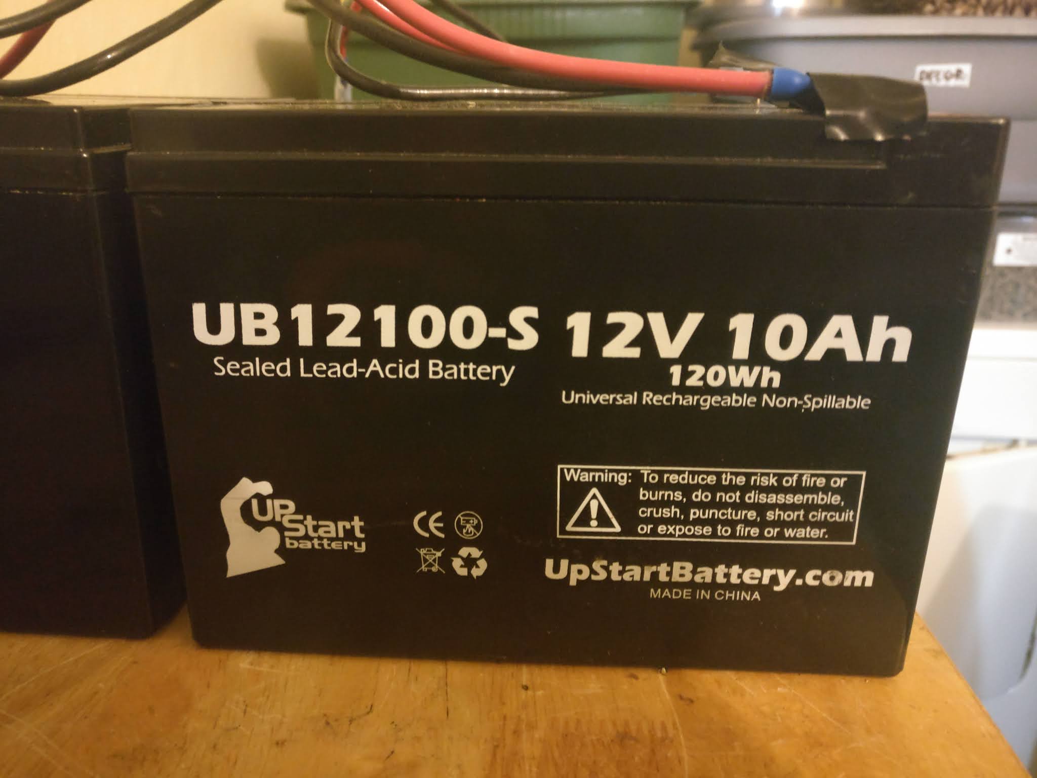 I had four of these batteries leftover from my electric lawnmower. It uses two in series to drive a 24V motor. After around four years of ownership the first set of batteries weren’t quite able to finish one lawn, so I ordered replacements. The two replacements turned out to be horrendous, so I ordered a second set. Then the company that sent me the bad batteries sent me another two good batteries. This long-winded and complicated story is how I ended up with four not-totally-terrible batteries to use for some light duty battery applications. Two sat in my garage for months, and the two that I thought were good I wired up in parallel to drive a 12V pump for an irrigation system.