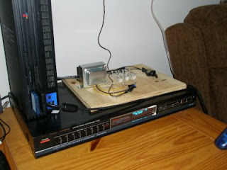 I got the original voltage divider circuit working. In the picture you can see the transformer (the big, stainless-steel box on the left, screwed onto the board) attached to three much larger resistors than were in the previous post. These are specialty 10-watt resistors that Radioshack makes that I did not know about until I was in trying to find the transformer. There are two one-ohm resistors and one ten-ohm resistor, which makes life a LOT simpler than that array of resistors I had set up before. Much easier to wire up and I know the power ratings are good.