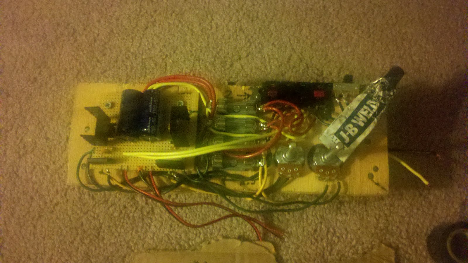 Time to start assembling it all together. I didn’t need it to be pretty, it just had to work. So I got a piece of scrap plywood and started screwing down all the parts. I decided I could save space by making the transformers “legs” by mounting them to the bottom, and attaching the rest to the top.
